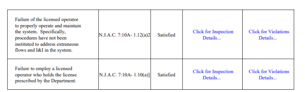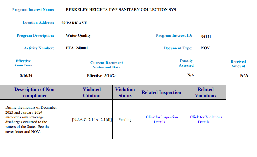 Additionally, the DEP’s notes available on their website shows that plant was cited for not having a properly licensed operator in place to run the collection system and for failing to put in procedures to control infiltration and inflow. While the record now lists these violations as “satisfied,” the fact that they were issued at all raises obvious questions: how or why did Berkeley Heights allow its sewer system to run without the state-required credentials and basic maintenance safeguards?