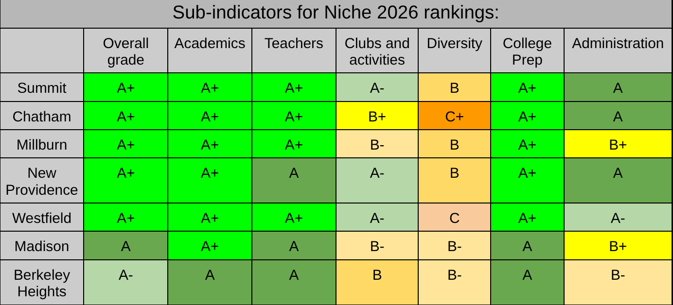 Using NJ21st’s seven-district dashboard of comparable districts surrounding Berkeley Heights, below are Niche’s 2026 rankings in comparison to 2025 (released one year ago):