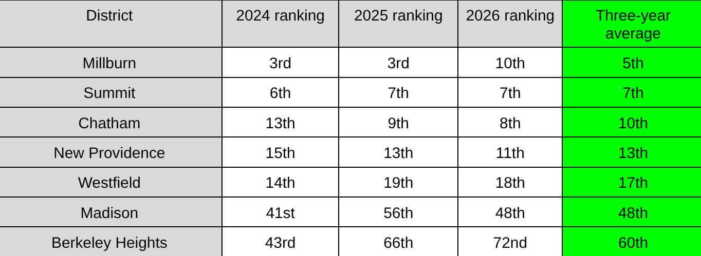 Summit, Chatham, Millburn all bunched up in Top 10 school districts in the state; New Providence earns 11th place.