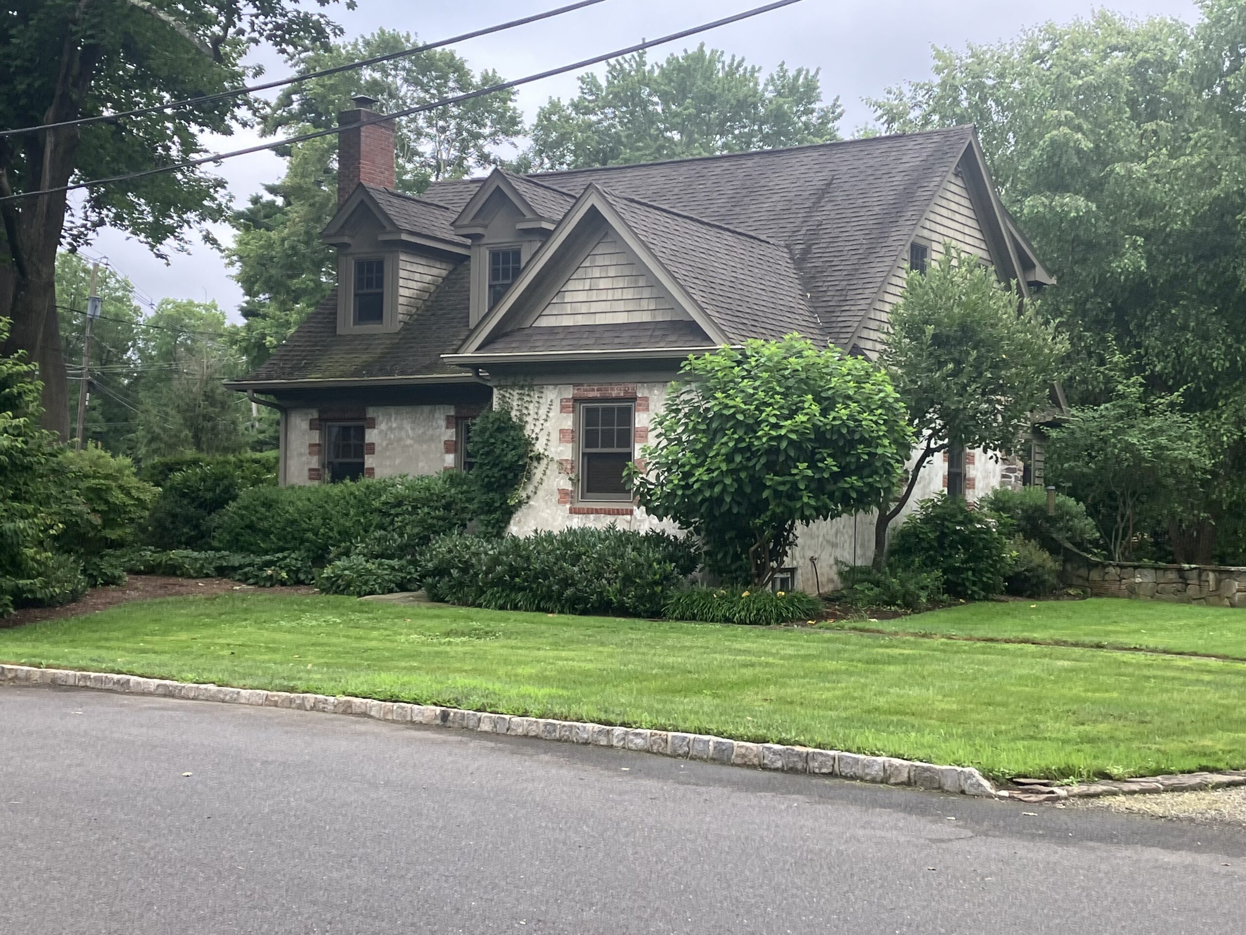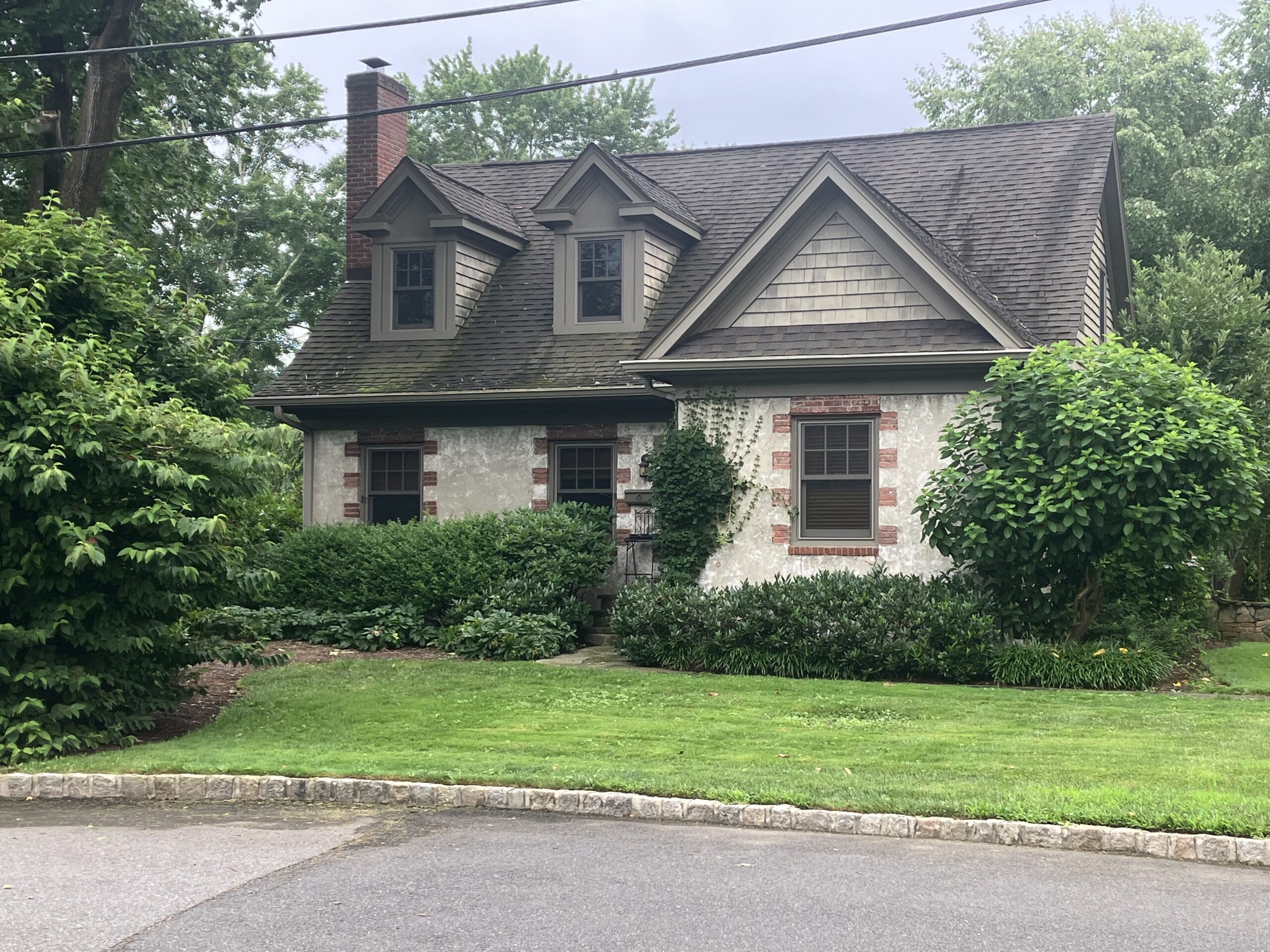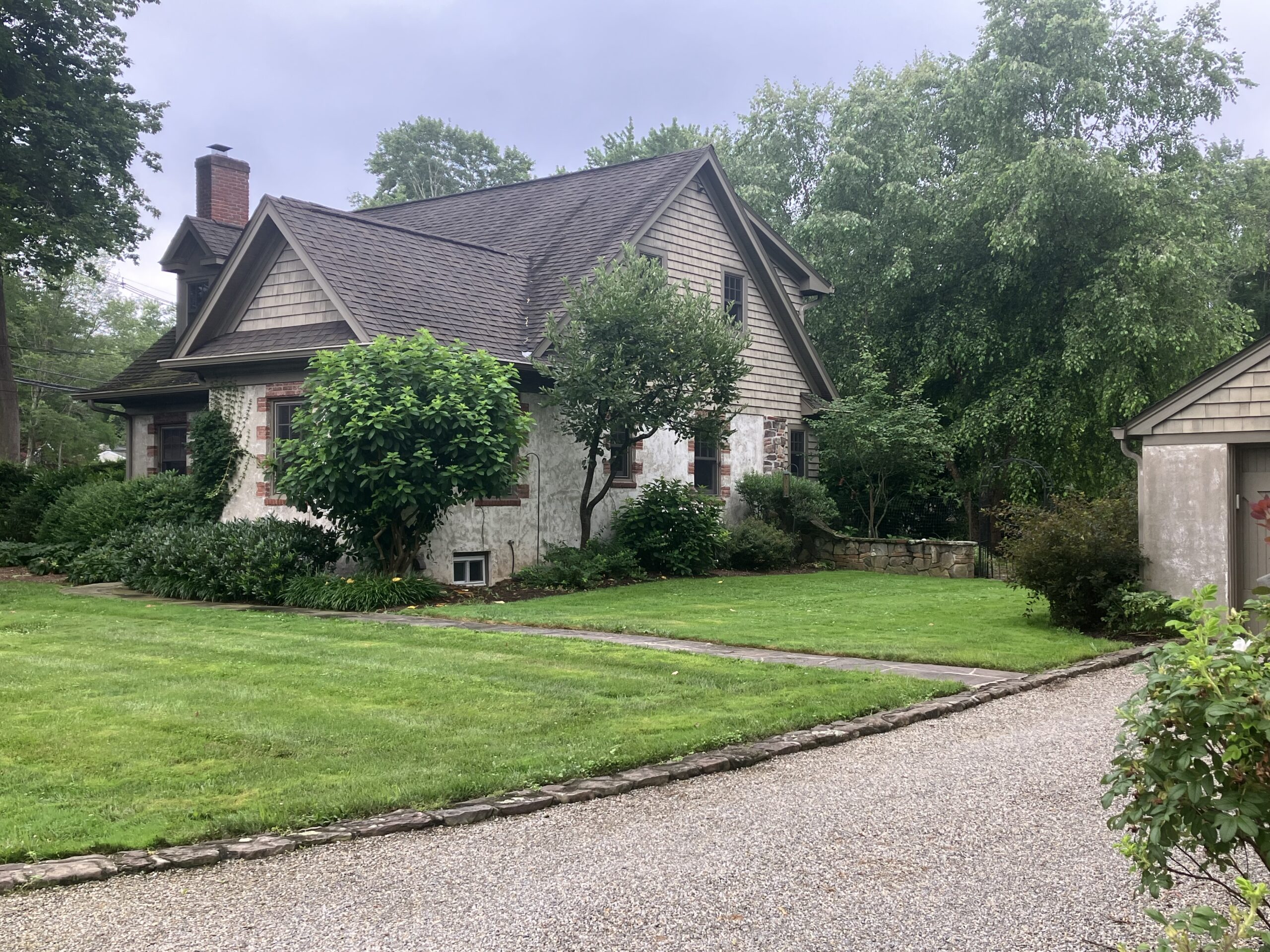 The home’s lines could be considered Cape Cod in architectural style, but the exterior finishes recall old-world European cottages. The stucco on the sides of the house is complemented by brick accents around the windows, climbing ivy, and a stone column on one side. A stone-lined gravel drive leads to a separate, complementary garage.