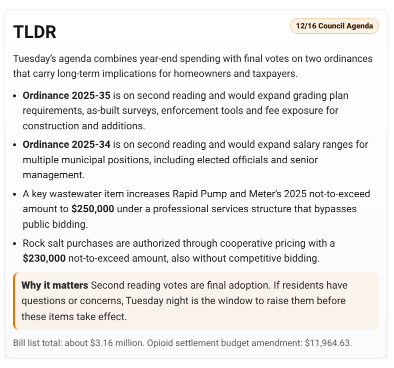 The 12/16 Berkeley Heights Town Council agenda is set to continue themes from recent meetings – year-end infrastructure spending, repeat vendors coming back for contract increases along with a mix of administrative and regulatory items. This meeting also includes two ordinances on second reading that carry long-term implications for homeowners and taxpayers alongside several resolutions that green-light significant spending.