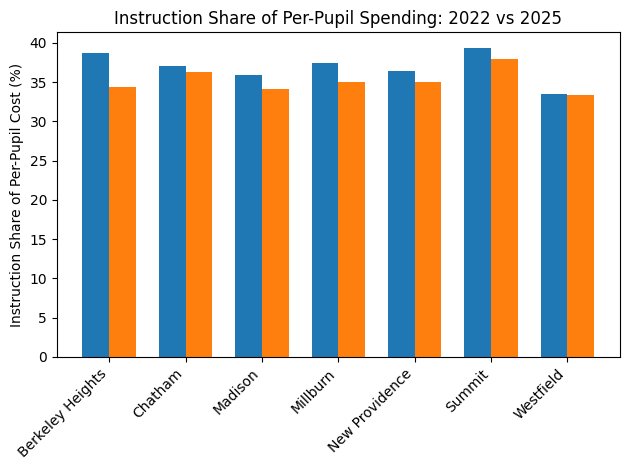 Berkeley Heights saw a noticeable decline in instruction’s share of the per-pupil dollar between 2022 and 2025 despite rising total costs.