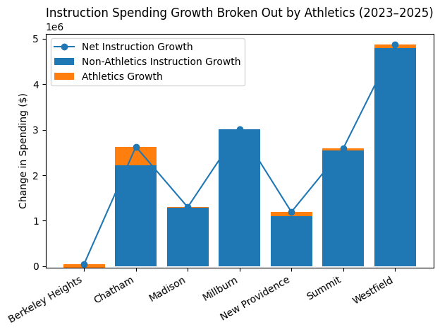 This means that, in Berkeley Heights (according to the numbers in the ACFR), the already modest increase in instruction spending was fully absorbed by rising athletics costs.