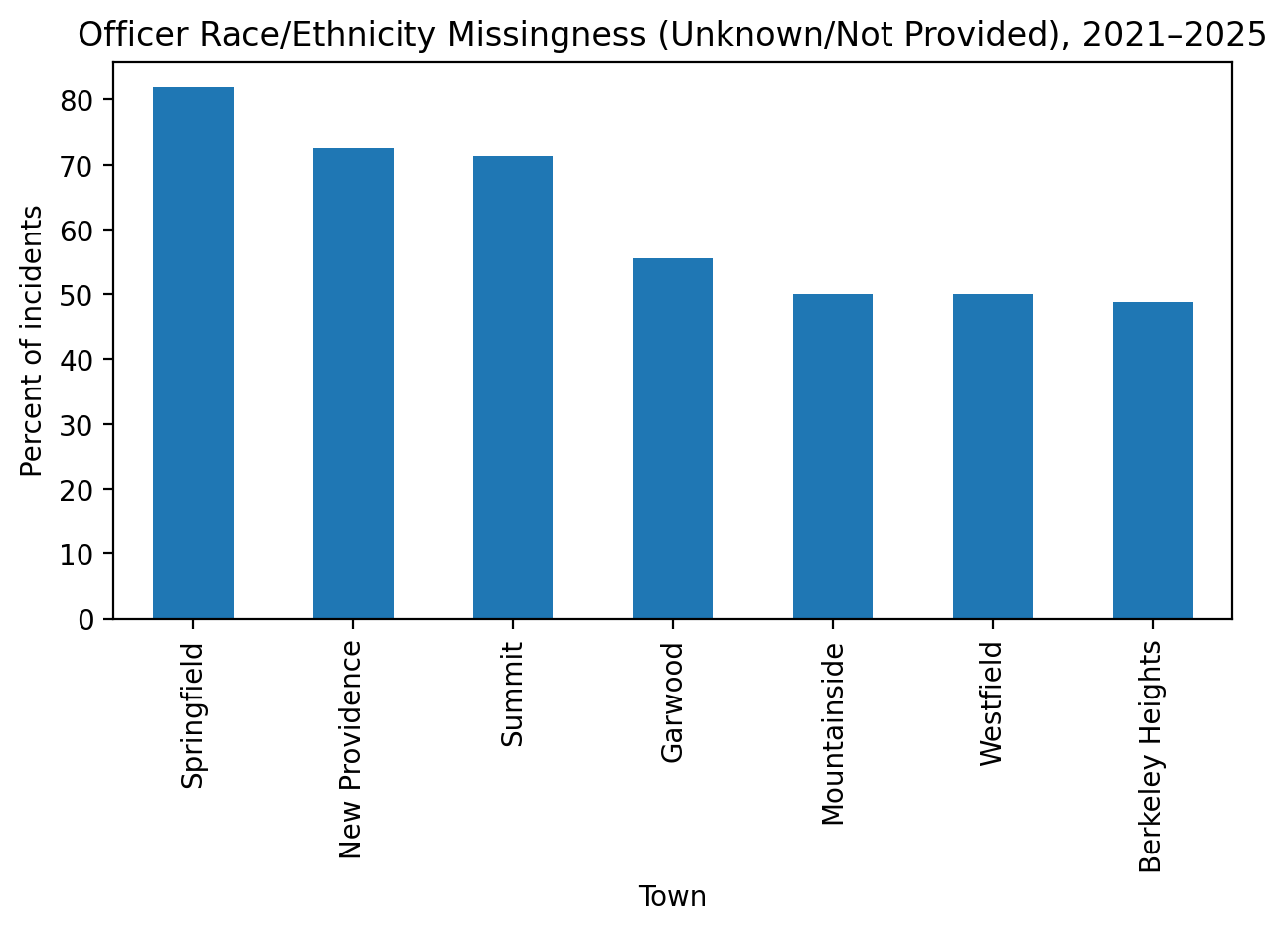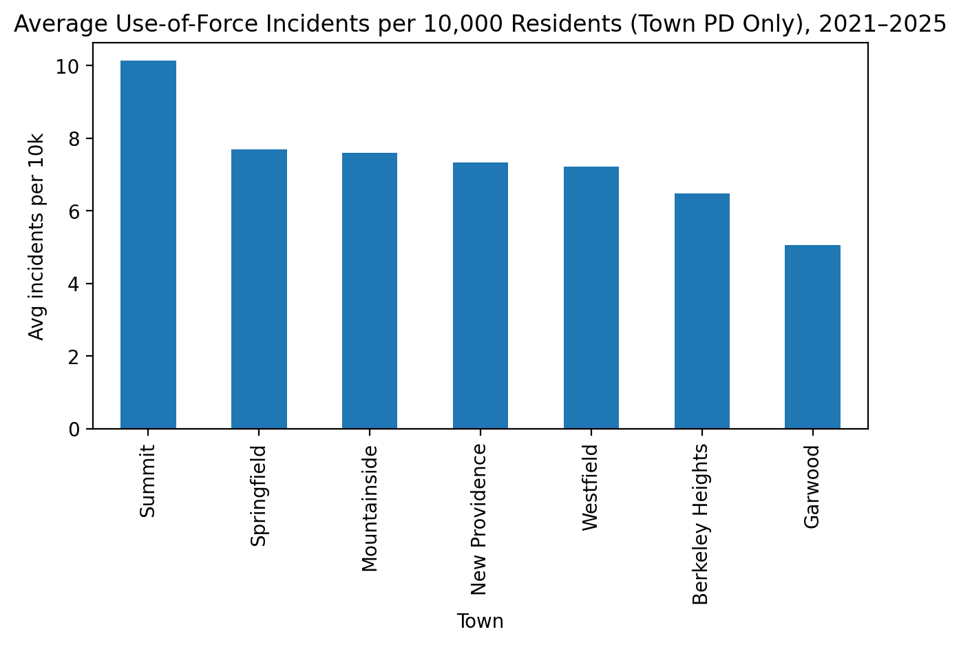 Summit reported a higher per Capita rate of use-of force incidents than the six other towns the report includes. Important to note that both Mountainside and Garwood are much smaller towns and both had very few incidents so their per capita rates should be viewed with caution since they can be more volatile.