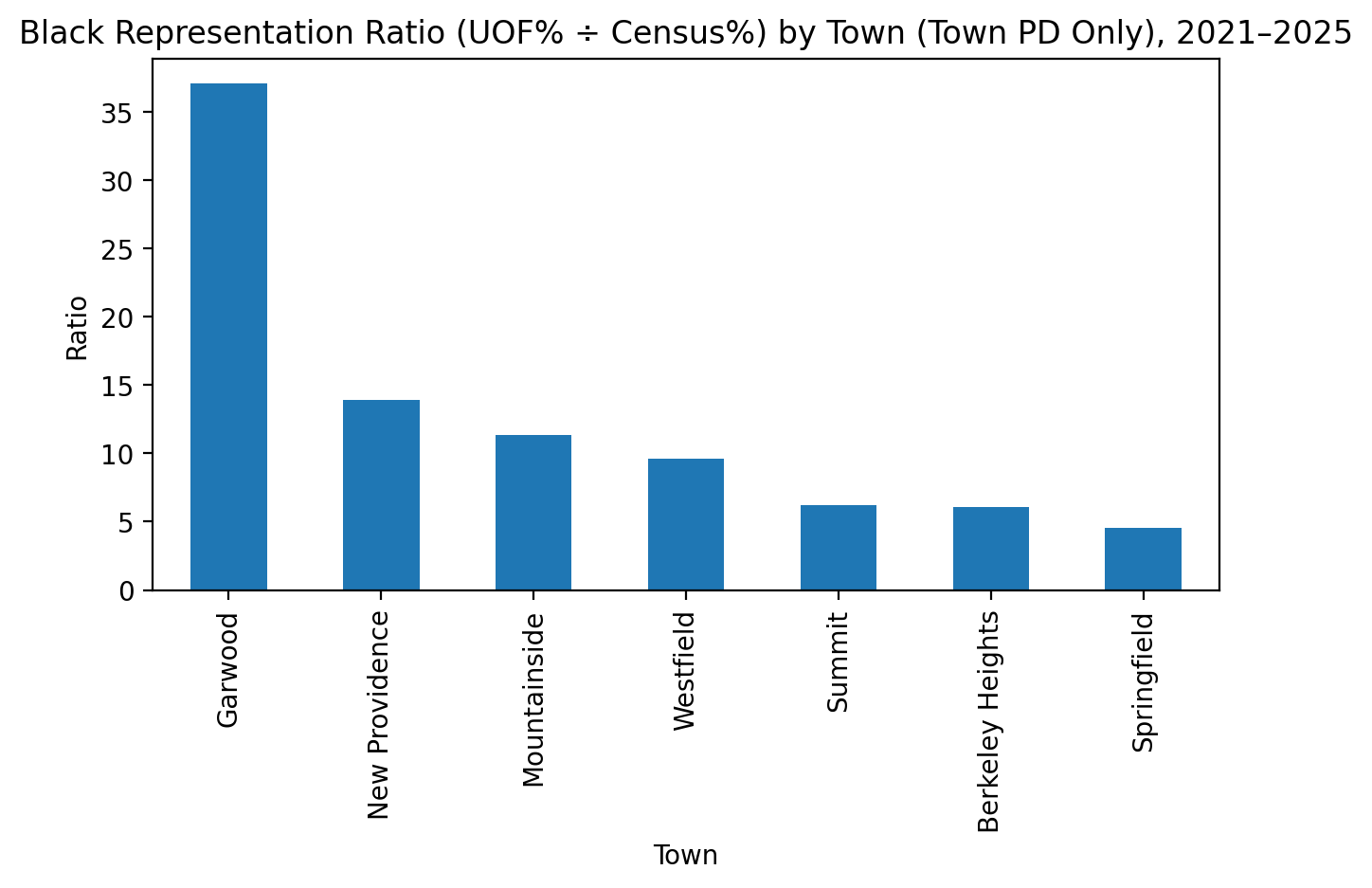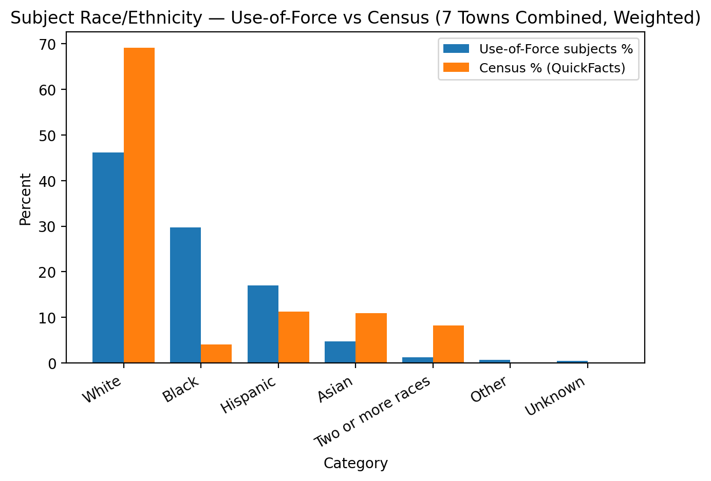 Black residents appear in use-of-force incidents more than 7 times higher than their share of the local population within these communities, Hispanics 1.5 times higher. Being that some of these towns have train stations, large retail sections and major highways surrounding them its important to keep in mind that SOME incidents may involve folks who do not live in these communities. However, the disparity remains a meaningful point of data for community discussion, regardless.