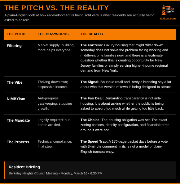 The opportunities these families worked for in New Jersey are disappearing, and Berkeley Heights is exhibit A- a local version of what is occurring across the state and a local government that pushes ‘happiness narratives’ as wealthy developers, law firms, engineering firms and a whole host of other consulting groups have their hands in municipal and city pockets while throwing a pittance of affordable housing that is more of an insult than the solution that was promised as they layer one luxury complex over another.